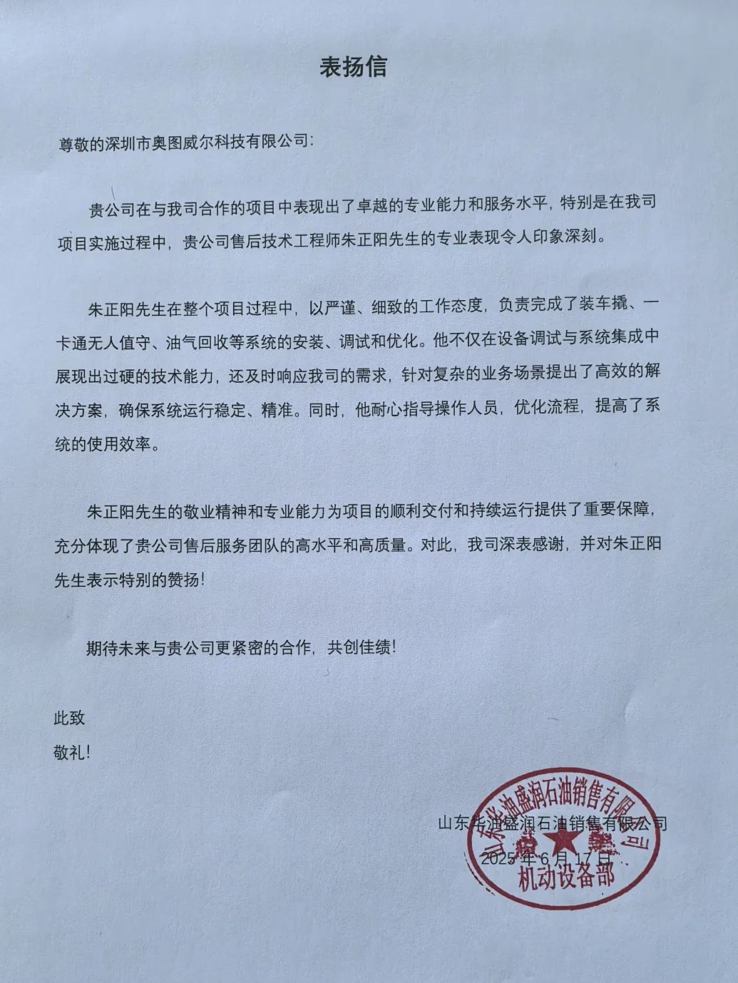 近日,深圳市奧圖威爾科技有限公司(以下簡稱“深奧圖”)售后技術部工程師朱正陽收到淄博鑫泰石化有限公司和山東華油盛潤石油銷售有限公司發(fā)來的正式表揚信,對其在項目中的卓越表現(xiàn)給予高度評價。這不僅是客戶對朱正陽個人能力的認可,更是對深奧圖服務理念的充分肯定。
