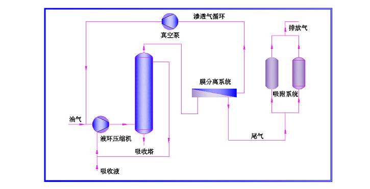 目前國際流行的油氣回收方案是采用膜與其他技術耦合的工藝。下圖給出了歐洲新上油氣回收裝置采用最多的工藝流程。該流程集成了壓縮/冷凝、吸收、膜分離、變壓吸附等工藝原理,充分發(fā)揮各技術的優(yōu)點,避其缺點,使整個油氣回收工藝達到最優(yōu)。如下圖所示: